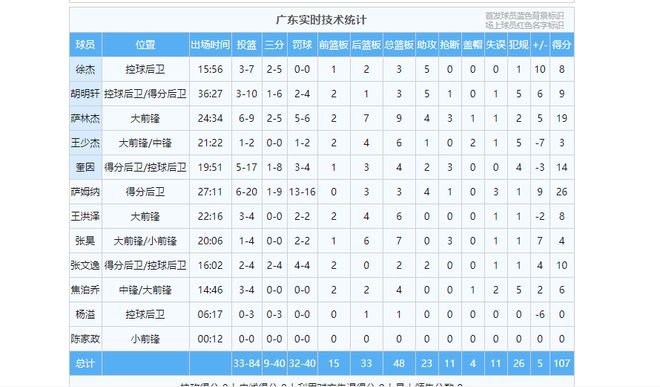 广东男篮首轮击败同曦男篮得到107分 其中外援萨林杰得到19分、奎因得到14分、萨姆纳得到26分。外援累计得到59分,外援得分占比约为55.14%。