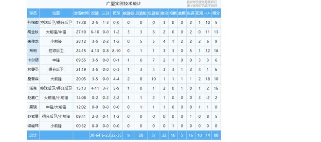 广厦男篮首轮击败山西男篮得到88分 其中外援桑普森得到10分,布朗得到16分,卡尔顿得到6分,塔克得到16分。外援累计得到48分,外援得分占比约为54.55%。