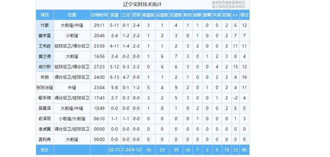 辽篮男篮首轮击败天津男篮得到80分 其中外援莫兰德得到4分,威尔斯得到12分,布朗得到16分。外援累计得到32分,外援得分占比为40%。