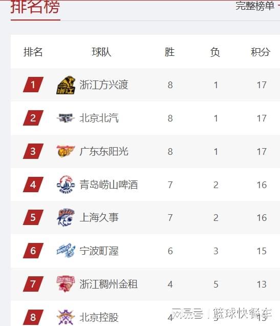 CBA积分榜最新排名!北京大胜帮广厦冲上第1:广东第3辽宁第10