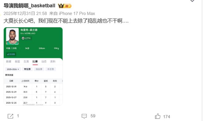 辽宁球迷怒斥莫兰德是一点用都没有!辽宁队当初签回莫兰德是咋想的?护框不顶用,进攻又吃瘪;就连一向站在辽宁这边的“知名”媒体人导演,也忍不住说起了莫兰德:长长心吧,不能上去除了捣乱啥也不干啊!
