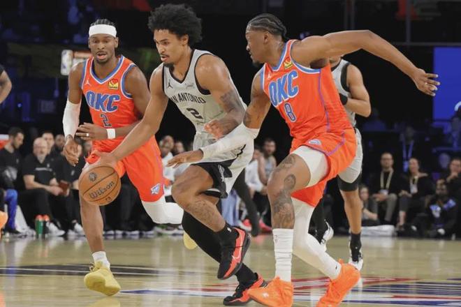 防守端马刺队有文班亚马这个BUG级的联盟最佳防守球员,所以球队防守体系非常容易建立,目前球队防守效率113.1排名全联盟第6,队内所有球员在这个体系中都有防守加成,简单点说,即便第一层外线防守被突破,对手进入内线面对的也是恐怖的文班亚马封盖干扰,马刺队外线防守球员只需紧跟进攻人,不给投篮空间,甚至可以故意把他驱赶到文班亚马的防守覆盖区遭受打击,防守压力相比其他球队减少一个级别. 迪伦在替补时间段、体能充沛的情况下更是扮演着领防对手持球手角色,纠缠能力和撕咬能力非常到位,对手场均在其面前出手6.6次在马刺队内排名第10,命中2.7球,限制对手命中率到41.5%,平均降低对手命中率3.5个百分点,是马刺队内防守效率第三高球员,仅低于文班亚马恐怖的降准10.7%和科尔内特的降准5%,他出色的完成了上场后的防守任务.