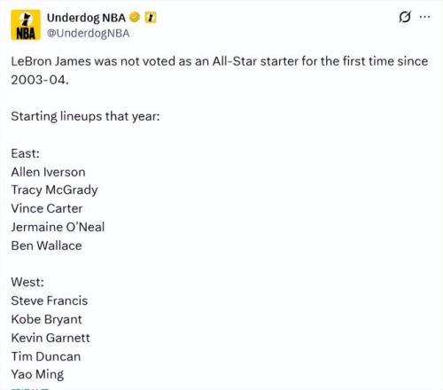 詹姆斯几乎肯定会以某种形式出现在全明星赛的舞台上。 自2005年至2025年,詹姆斯连续21次当选全明星首发,这一数据恰好印证了他在过去二十余年里,在NBA赛场所展现出的绝对统治力。这是自2003-04赛季新秀赛季以来,詹姆斯首次未能通过投票入选全明星首发阵容。 詹姆斯的新秀赛季效力于克利夫兰骑士队,彼时的东部全明星首发阵容由艾弗森、麦迪、卡特、本-华莱士与杰梅因-奥尼尔构成。西部全明星首发阵容为弗朗西斯、科比、加内特、蒂邓肯以及姚明,这份名单堪称星光熠熠。