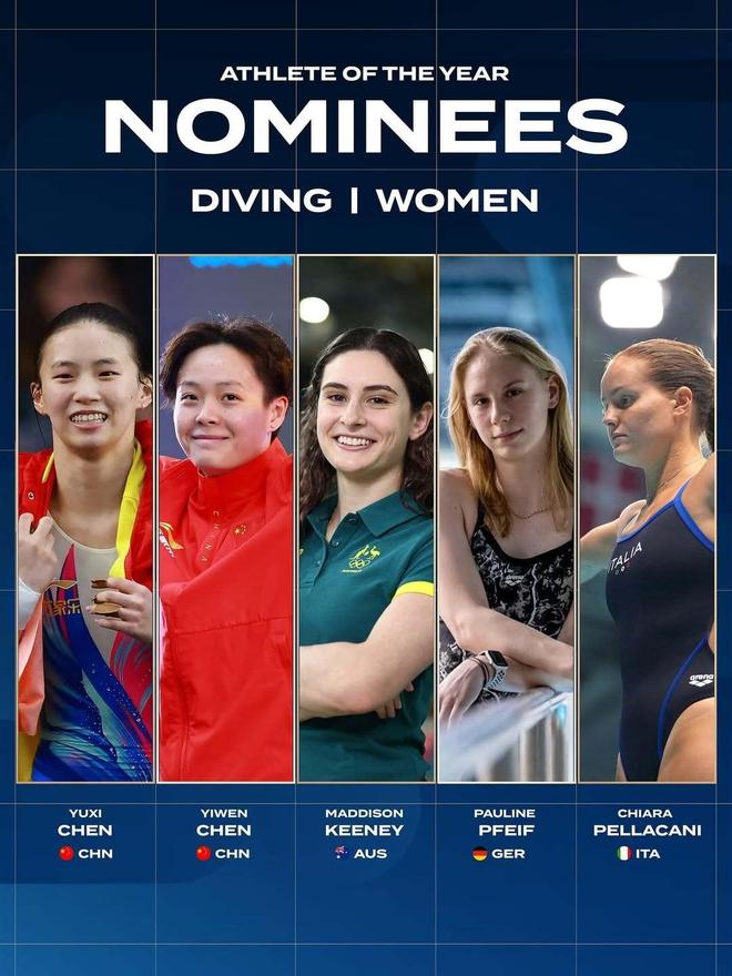 世界泳联年度最佳女子跳水运动员候选:陈芋汐、陈艺文入选