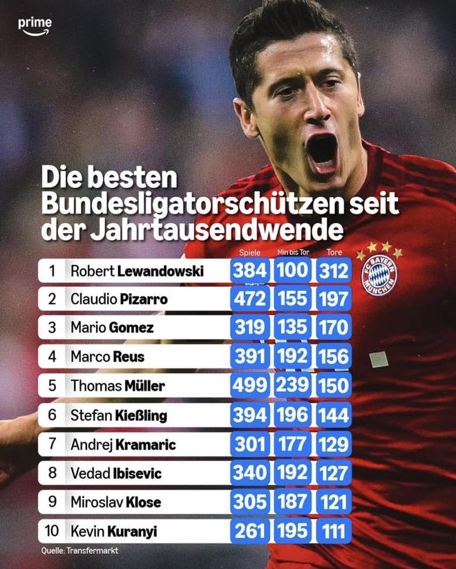 最近Prime发了《千禧年以来德甲最佳射手榜》。皮萨罗、戈麦斯、罗伊斯、穆勒这些名字都在,光看出场和进球就已经很有冲击力。更夸张的是榜首那个人,进球数直接把第二名甩出一大截,数字看着都离谱。数据截至2026年1月2日。 1 莱万多夫斯基 | Robert LEWANDOWSKI国籍:波兰 年龄范围:21–33岁 主要效力俱乐部:多特蒙德、拜仁慕尼黑 出场:384场 进球:312球 场均进球:0.81球/场 每球分钟:100分钟