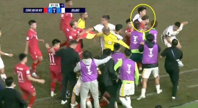 冲突持续了将近1分钟左右,之后主裁判介入,给曹永竞掏出红牌,再给双方的肇事者各掏黄牌一张。王刚引起冲突没红牌,为何曹永竞却染红呢?观察视频重放发现,原来有一名对手球员追着王刚讨说法,曹永竞上去就是一个右手卡脖(下图)。可能就是因为这个动作让主裁判将他罚下。