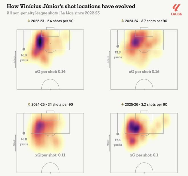 维尼修斯保持边路宽度,也意味着他不再像上赛季在安切洛蒂手下那样,能在禁区内接应传中或在中路反越位前插。这一点在他的射门分布上体现得十分明显。 如下方图片所示,他本赛季的射门质量明显下降,位置也更远离球门。
