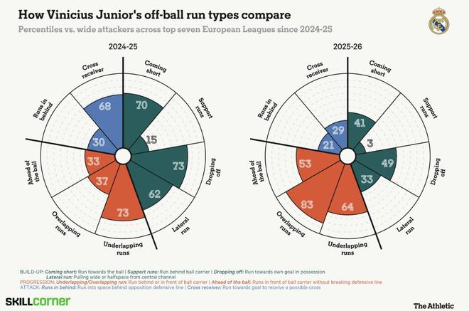 由于他在进攻三区停留的时间增加,他的触球数提升至每90分钟63.2次(2023-24赛季为58.8次,上赛季为58.5次)。但他在中路区域的触球却下降到每90分钟仅6.97次,低于此前两个赛季的9.9次和9.8次,这对他的创造力和进球能力产生了重大影响。 在2023-24和2024-25赛季,维尼修斯在左侧肋部的传球能力有了显著提升。下方示例中,罗德里戈和何塞卢(两次)完成了反越位跑动供他传球,而贝林厄姆和姆巴佩也从这些传球中受益。 直塞球逐渐成为他的武器,这对一名此前被认为在这一环节缺乏冷静、更多依赖传中的球员而言是重要进步。 然而,在阿隆索体系下更靠边踢球,限制了维尼修斯送出此类传球的机会。 像对阵马竞为居莱尔送出的那种传中变得更加常见,但在对手往往堆积禁区、而皇马又缺乏显著空中优势的情况下,这条进攻路线并不高效。 下方图表使用Skillcorner数据,对比了维尼修斯上赛季和本赛季无球跑动类型的变化,也从另一个角度说明了他角色的转变。他现在更多进行外线套边跑动,内切跑动减少,同时回撤接球、进行快速传跑配合的机会也在下降。