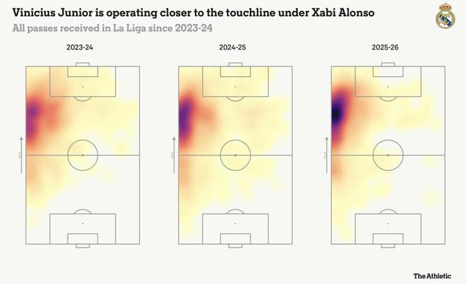 想象一下全速推进的维尼修斯。 皇家马德里提高比赛节奏,在左翼找到处于空当中的他。当防守球员试图逼近时,他加速完成突破,随后突然减速,要么送出传中,要么继续向前推进完成射门。 近年来,我们已经无数次看到这位巴西前锋展现这样的画面——而他在9月对阵马德里竞技的德比战中,为居莱尔送出的那次助攻,就是一个典型例子。 但本赛季,维尼修斯这样的高光时刻却变得十分罕见,而上述那次进攻片段,恰恰发生在皇马一场2-5失利的比赛中。 这位25岁的球员似乎状态下滑,本赛季已经不止一次在伯纳乌球场遭到自家球迷的嘘声。在周四进行的西班牙超级杯半决赛中,马竞主帅蒙尼甚至利用这一点试图激怒他,看起来是在对他说:“弗洛伦蒂诺会把你卖掉的。” 在2023-24赛季,维尼修斯在西甲和欧冠中打入21球、送出9次助攻,帮助皇马包揽两项冠军。超级巨星姆巴佩的到来,在上赛季一定程度上放慢了他的节奏,但即便如此,2024-25赛季他仍在这两项赛事中贡献了19球和10次助攻。 而在本赛季,在新任主帅哈维-阿隆索麾下,维尼修斯在西甲和欧冠25次出场中仅打入5球,并为队友送出7次助攻。比赛中令人欢呼的瞬间减少了,取而代之的是更多带着失望情绪的嘘声——即便是在上周末5-1大胜皇家贝蒂斯的比赛中也是如此。他已经连续16场俱乐部比赛没有进球,上一次破门还是10月4日3-1击败比利亚雷亚尔时梅开二度。 场外,同样问题重重。 他的合同将在下赛季结束后到期,而续约谈判已经陷入停滞。去年10月,在国家德比对阵巴塞罗那的比赛中,他在还剩20分钟时被换下,愤怒地提前离场。几天后,他告诉俱乐部主席弗洛伦蒂诺,在自己与阿隆索关系紧张的情况下,他认为此时续约并不符合自身利益。 而在场上,一个更大的问题正在浮现:他在皇马体系中究竟该如何定位。The Athletic对此进行了解释。 自今年夏天阿隆索出任皇马新帅以来,维尼修斯的位置与过去两个赛季相比已经发生了变化。 前任主帅安切洛蒂更倾向于让球员在比赛中自行寻找解决方案,而不是要求他们严格执行固定阵型和明确的个人职责。 在2023-24赛季,随着本泽马的离队,皇马经常在没有正印9号的情况下比赛,中场球员贝林厄姆以“伪九号”身份首发。上赛季,新援姆巴佩成为进攻核心,但他也经常从左路内切。 这一切都意味着,维尼修斯可以在进攻三区内自由活动。 但在阿隆索麾下,他的职责逐渐变成了在左路保持位置,并由边后卫或中场在肋部提供支持。下方展示的维尼修斯接球区域图,正体现了这一点。