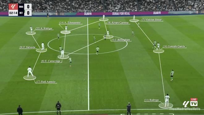 阿隆索的战术理念强调结构化控球和区域压制。本赛季,皇马在西甲每90分钟在进攻三区的触球数达到246.5次,是过去七个赛季以来的最高值;而他们在防守三区的触球数为180.4次,是同期最低。 他们的阵型往往呈现出下图所示的样子(对阵贝蒂斯的比赛),目的是通过站位拉扯制造对手防线的空隙,再利用后插上跑动进行打击。为了让这一计划奏效,维尼修斯必须始终待在边路,吸引一到两名防守球员。
