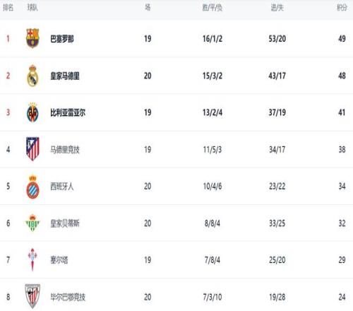在积分榜上,巴萨16胜1平2负,拿到49分排名榜首。皇马赢球后紧追巴萨。皇马的积分是48分,只落后巴萨1分。不过,巴萨比皇马少赛一场。比利亚雷亚尔总积分是41分,排名第3。第4的是马竞,只拿到38分。西班牙人这匹黑马的总积分达到34分,排名第5。皇家贝蒂斯以32分排名第6。塞尔塔29分,排名第7。 |