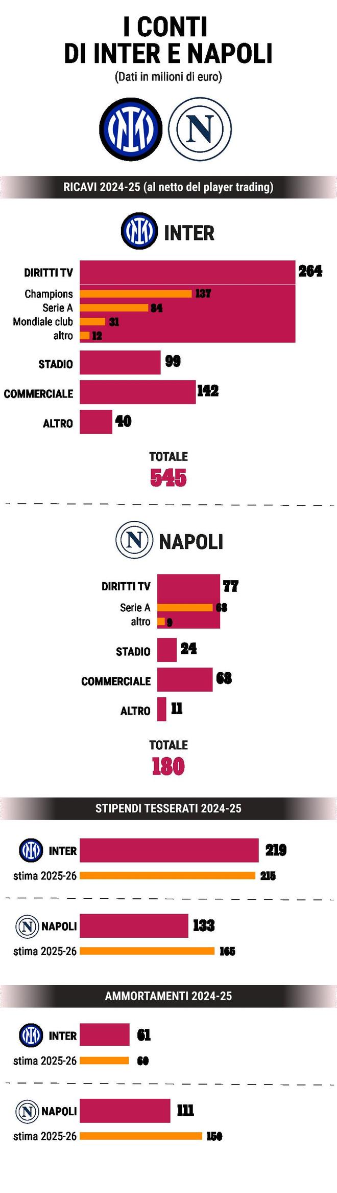 作为意甲冠军,那不勒斯从意甲联盟获得的收入,仅为欧联亚军国际米兰从欧足联那里所得的一半。这正是两队明日对决背后,经济实力存在差距的原因之一。国际米兰拥有全球影响力,上赛季更创下了意大利足坛的收入纪录——不含球员交易收入达5.45亿欧元,其中超三分之一来自球队闯入欧冠决赛的出色表现(尽管最终不敌巴黎圣日耳曼)。 反观那不勒斯,其意甲球迷数量位居第四,仅次于尤文图斯、国际米兰和AC米兰。尽管过去三年两夺联赛冠军,但受缺席欧战赛事的影响,2024-25赛季收入骤降至1.8亿欧元,远低于2022-23赛季的2.75亿欧元和2023-24赛季的2.55亿欧元。 不过,若对比球队阵容成本,双方的差距便会缩小,趋势也随之逆转。我们不妨按顺序逐步分析。若依据上赛季最新的官方数据对比,结果可能存在误导性。毕竟上赛季对国际米兰而言堪称非凡:总收入5.45亿欧元中,电视转播权收入2.64亿欧元,商业收入1.42亿欧元,球场收入9900万欧元,其他收入4000万欧元。 国际米兰电视转播收入的大幅增长(其中意甲方面收入8400万欧元),主要得益于欧冠赛事(1.37亿欧元)和参加新世俱杯(3100万欧元)。而圣西罗球场创下的收入纪录,同样离不开球队在欧战赛事中的亮眼发挥。此外,国际米兰在非欧战方面的收入也是那不勒斯的三倍。 那不勒斯1.8亿欧元的收入构成如下:电视转播权收入7700万欧元(其中6800万欧元来自意甲联盟),商业收入6800万欧元,球场收入2400万欧元,其他收入1100万欧元。