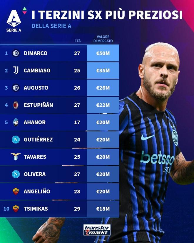 1、迪马尔科(国际米兰) 5000万欧元 2、安德烈亚-坎比亚索(尤文图斯) 3500万欧元 3、卡洛斯-奥古斯托(国际米兰) 2600万欧元 4、埃斯图皮尼安(AC米兰) 2200万欧元 5、阿哈诺尔(亚特兰大) 2000万欧元 5、米格尔-古铁雷斯(那不勒斯) 2000万欧元 5、努诺-塔瓦雷斯(拉齐奥) 2000万欧元 5、马蒂亚斯-奥利韦拉(那不勒斯) 2000万欧元 5、安赫利尼奥(罗马) 2000万欧元 10、齐米卡斯(罗马) 1800万欧元 |