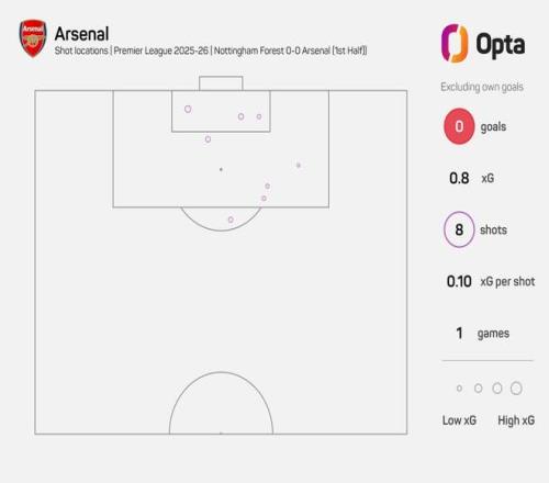 英超第22轮,阿森纳客场对阵诺丁汉森林,上半场阿森纳完成8次射门,但无一射正,射门次数为阿尔特塔治下阿森纳没射正的英超上半场第二多的。