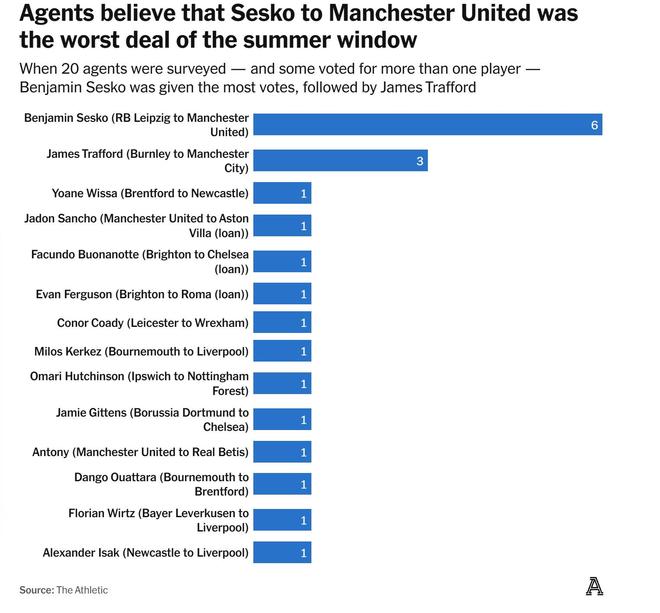 其他被点名的交易包括比诺埃-吉滕斯从多特蒙德到切尔西(“对他来说完全是错误的俱乐部”)、丹戈-瓦塔拉从伯恩茅斯到布伦特福德(“为无法填补他们出售球员所留下空缺的人支付 4200 万英镑,这散发着绝望的气息”)、维萨从布伦特福德到纽卡斯尔(“为一名 29 岁且在引援偏好名单上排名靠后的球员花这么多钱”),以及那位似乎是足球界评价两极分化的人物——哲凯赖什(“英超关乎速度和敏捷,我不确定他具备这些“)。