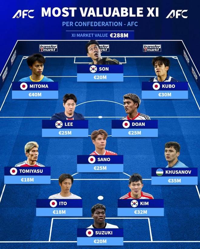 门将 铃木彩艳(日本/帕尔马)1800万欧元 后卫 胡桑诺夫(乌兹别克斯坦/曼城)3500万欧元、金玟哉(韩国/拜仁慕尼黑)3200万欧元、伊藤洋辉(日本/拜仁慕尼黑)1800万欧元、富安健洋(日本/无)1800万欧元 中场 堂安律(日本/法兰克福)2500万欧元、佐野海舟(日本/美因茨)2500万欧元、李刚仁(韩国/巴黎圣日耳曼)2500万欧元 前锋 久保建英(日本/皇家社会)3000万欧元、孙兴慜(韩国/洛杉矶)2000万欧元、三笘薰(日本/布莱顿)4000万欧元 总身价:2.88亿欧元 【上咪咕独家看英超】 |