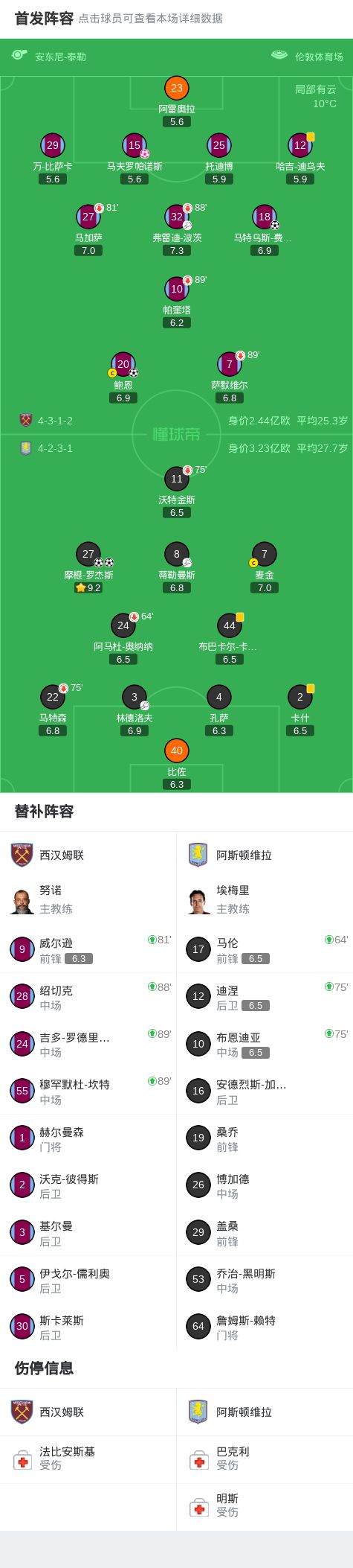北京时间12月14日英格兰足球顶级联赛 联赛 第16轮,西汉姆联主场对阵阿斯顿维拉。西汉姆联马特乌斯-费尔南德斯破门,鲍恩破门,马夫罗帕诺斯自摆乌龙。阿斯顿维拉摩根-罗杰斯梅开二度。最终比分西汉姆联 2-3 阿斯顿维拉。