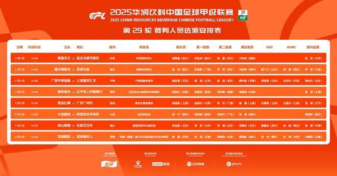 11月1日14:30,2025赛季中甲联赛第29轮也就是倒数第2轮8场比赛同时开球。赛前,中国足协发布了本轮裁判人员选派安排。